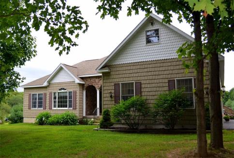 Horse Property For Sale, 10 Acres, Ranch Home - 199 Rice Road - Contact Bob McTague at 315-882-6610 - This 3 bedroom custom built ranch home is placed perfectly on a 10 acre lot with a beautiful view overlooking the horse paddocks from the extensive decking where you can watch the abundant wildlife that eat from the many apple trees. Built in 2009 with quality details throughout, such a solid oak doors, hardwood and tile floors, solid surface counter tops, stainless steel appliances in the kitchen, and high ceilings in the living area that are textured and have gold flakes glitter for a unique look. The exterior walls have blown-in foam insulation to ensure cost effective heating and the premier vinyl cedar shake siding has a lifetime guarantee. This impeccable home features a formal dining room, a large study, a vaulted living room with a wood burning fireplace, an expansive kitchen, a mudroom/laundry area from the garage, a spacious master bedroom with access to the deck to enjoy your morning coffee, a luxury master bath with a high end vanity and tiled shower, two other bedrooms, and another full bath. The attached garage is huge with extensive storage over the garage, accessible by a pull down ladder. The poured full-sized cellar has a walk out basement with access to the yard where you can enjoy summer and/or winter toys. There is an Amish built 20x24 barn/outbuilding with two horse stalls that have a sliding door so horses can come in and out at will and a lighted horse riding area as you come up the 400' fully paved driveway that has an electric entrance gate for security and privacy. Centrally located only 4 minutes to Route 81, a short hike to Little Salmon River, close to Mexico schools, and only 30 minutes to Syracuse.